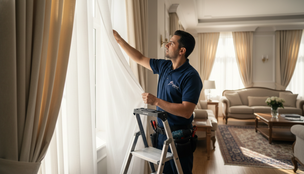 الخطوة الرابعة — الفحص النهائي والتسليم: قبل المغادرة، يتأكد الفني من فتح وإغلاق الستائر بشكل سلس، واستقامة التركيب، ورضاك التام عن النتيجة.